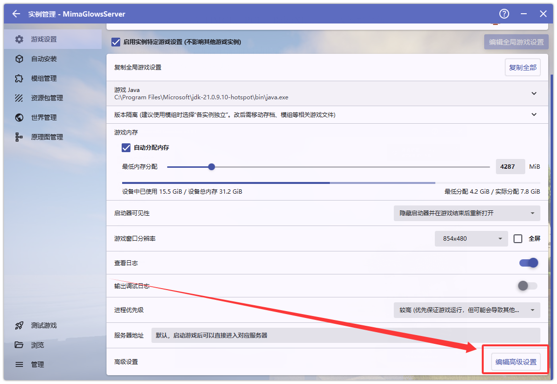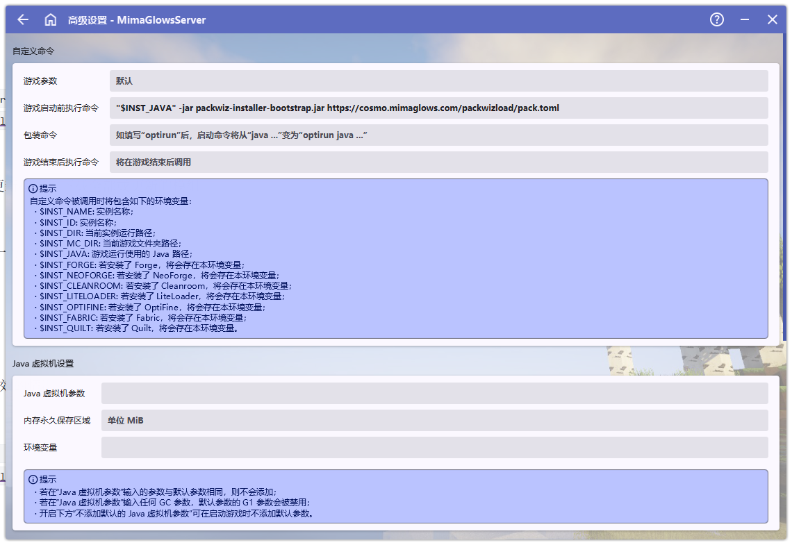 (3)在“游戏启动前执行命令”前输入"$INST_JAVA" -jar packwiz-installer-bootstrap.jar https://cosmo.mimaglows.com/packwizload/pack.toml